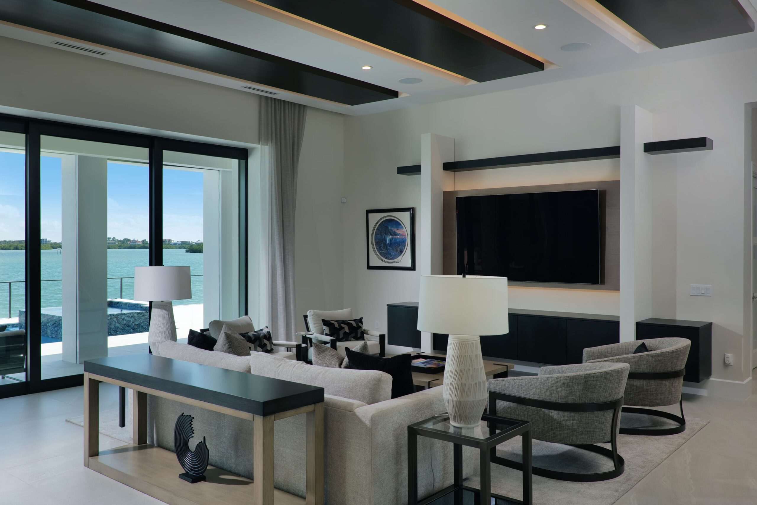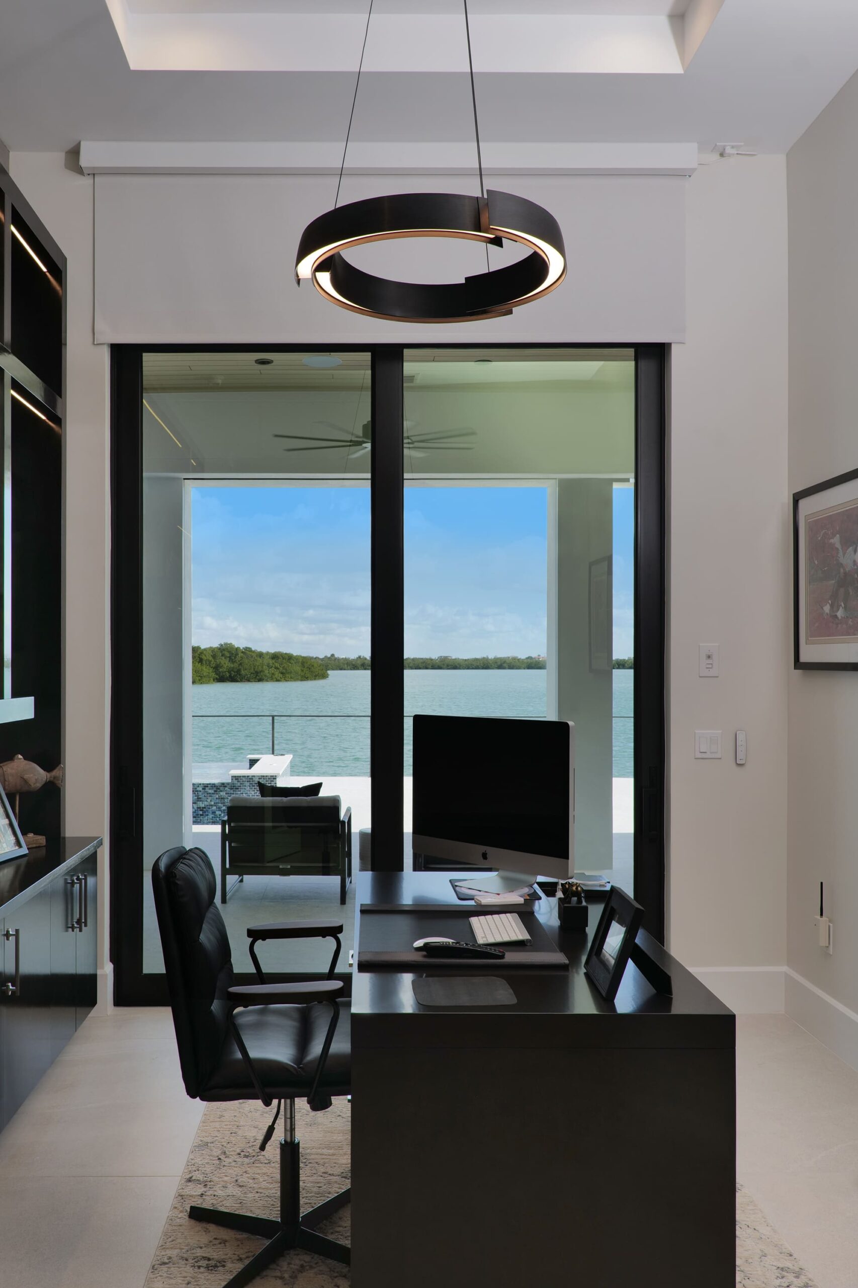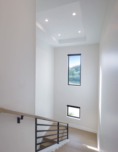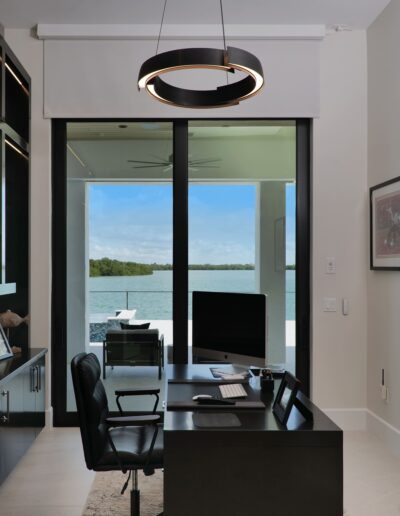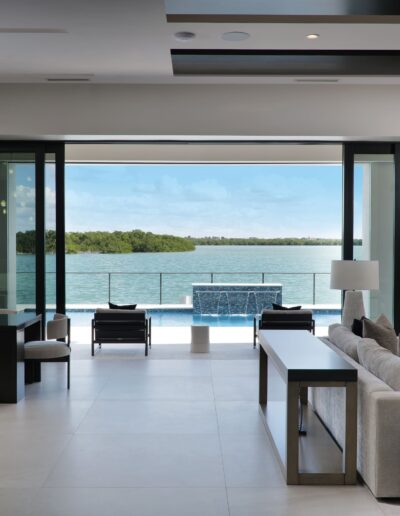 Clean lines and expansive open spaces define the interior, where natural light plays against striking dark-and-light design elements to create a sophisticated visual balance. Floor-to-ceiling windows frame coastal views, seamlessly connecting the indoors with the surrounding landscape and enhancing the home’s airy, spacious feel.