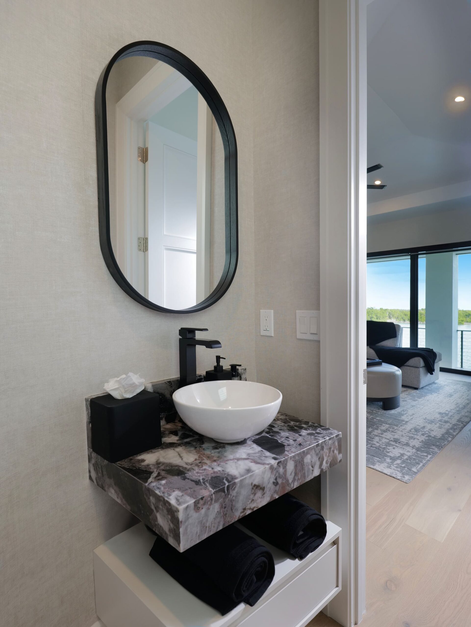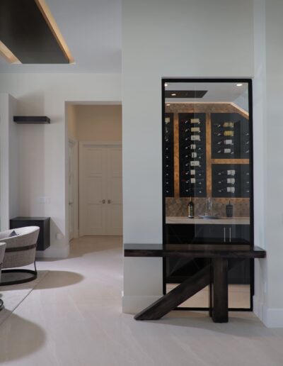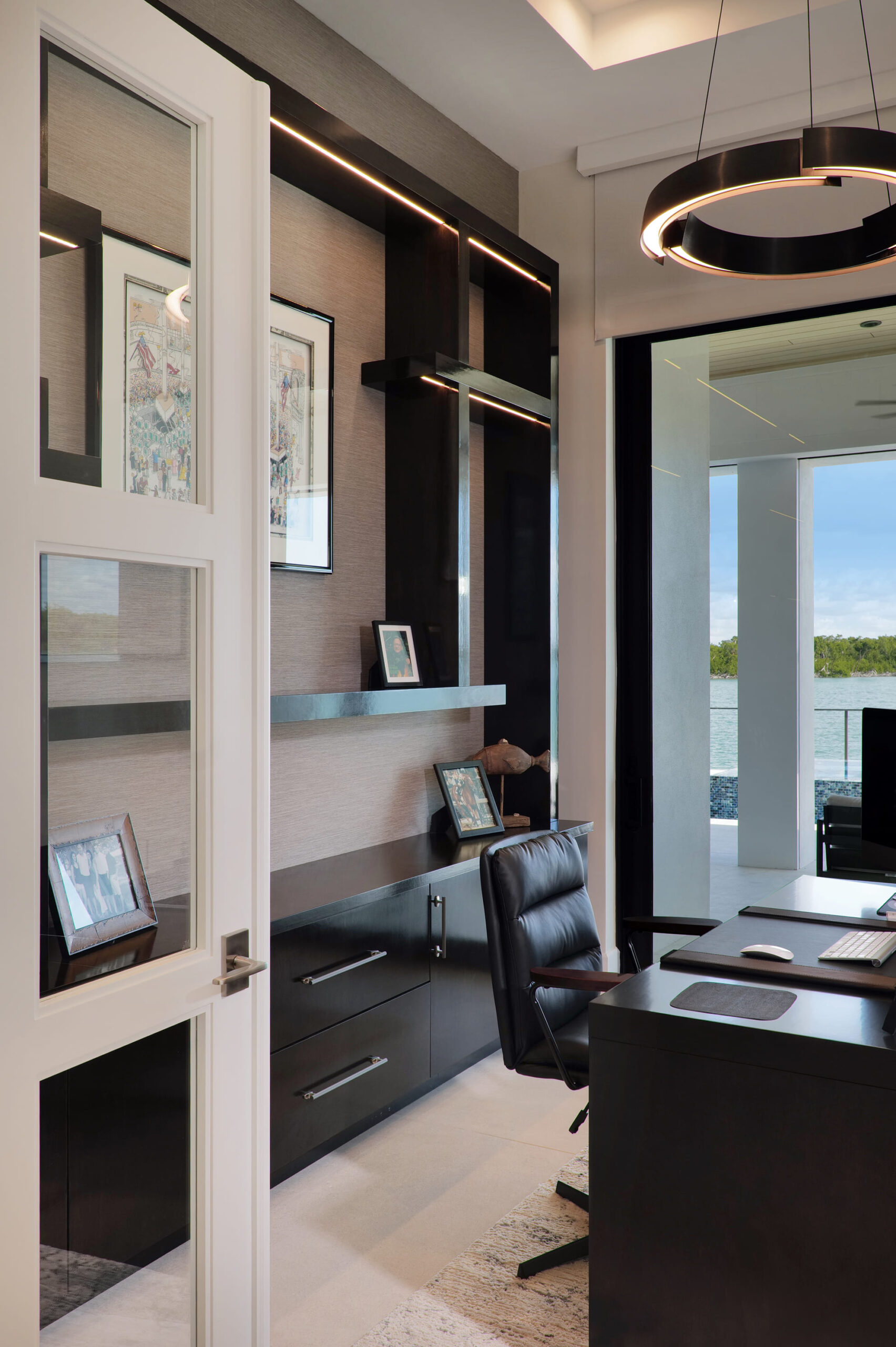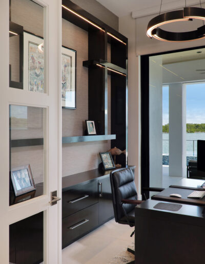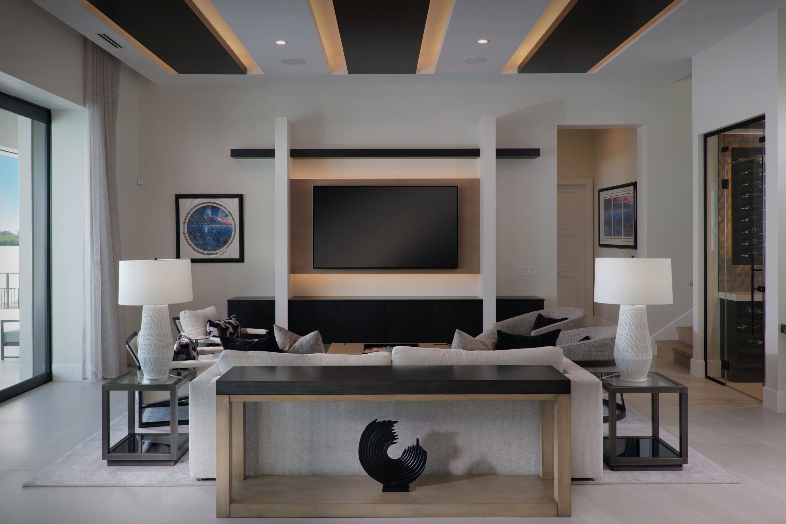 Clean lines and expansive open spaces define the interior, where natural light plays against striking dark-and-light design elements to create a sophisticated visual balance. Floor-to-ceiling windows frame coastal views, seamlessly connecting the indoors with the surrounding landscape and enhancing the home’s airy, spacious feel.